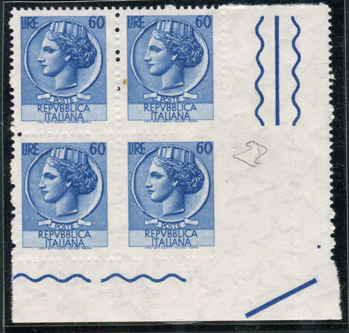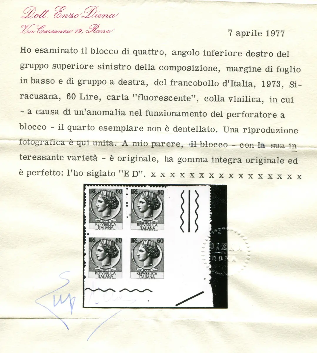 Syracusana Lire 60 (Vinyl) Sorte Blindverzahnung Vollgummi MNH - Syracusana Lire 60 Nr. 1078d (Vinylkautschuk) Viertel a. von f. mit dem Exemplar unten rechts ungezähnt, die anderen Exemplare blind gezahnt und teilweise unvollständig - Zert. ED - Sehr schön Cod. 739/13