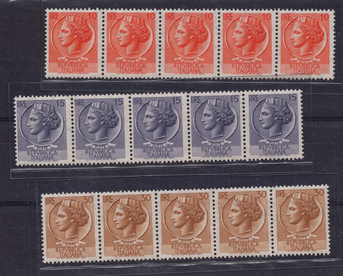 MNH - Vollgummi - - Syrakus Ausgabe für Verteilermaschinen - Die Serie von drei Sternenwerten Typ IV vertikal im Streifen von fünf Exemplaren, davon eines mit Zähler auf der Rückseite Sass. n. B 764/II - B 770/II) Cod.620/182