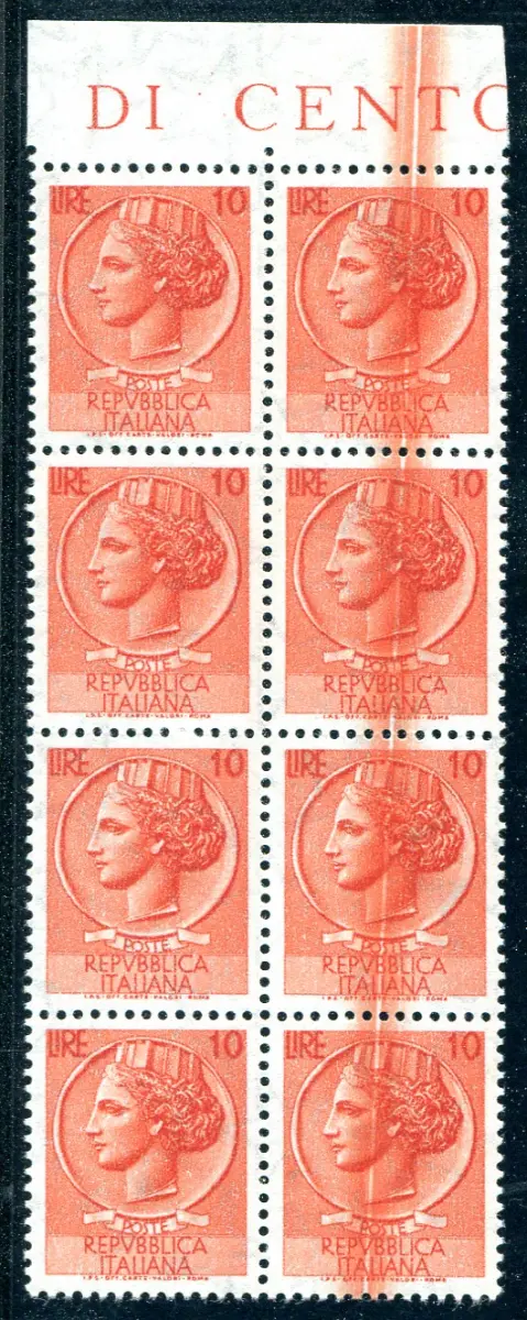 Syrakus Lire 10 Sortenblock chirurgischer Schnitt Vollgummi - Syrakus Lire 10 Sterne I. Nr. 764 Block von acht b. von f. mit auffälligem chirurgischem Schnitt auf vier Exemplaren Cod. 597/13