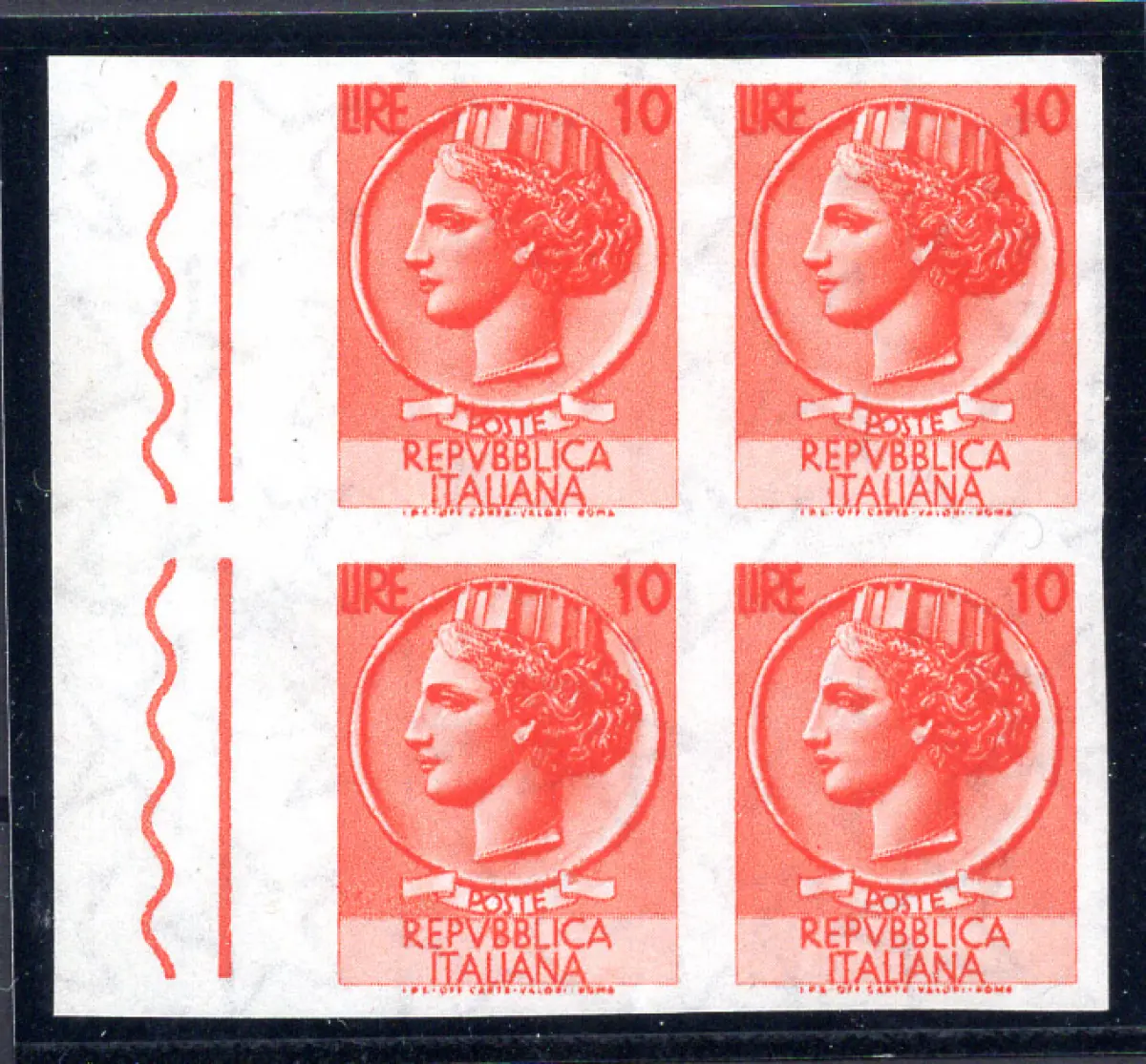 Syrakus Lire 10 Sterne I ungezähnt Vollgummi - Syrakus Lire 10 Nr. 764 Viertel ungezähnt b. von f. mit filigraner Außensinus Sterne I. horizontal - Selten - Zert. AD Cod. 596/13