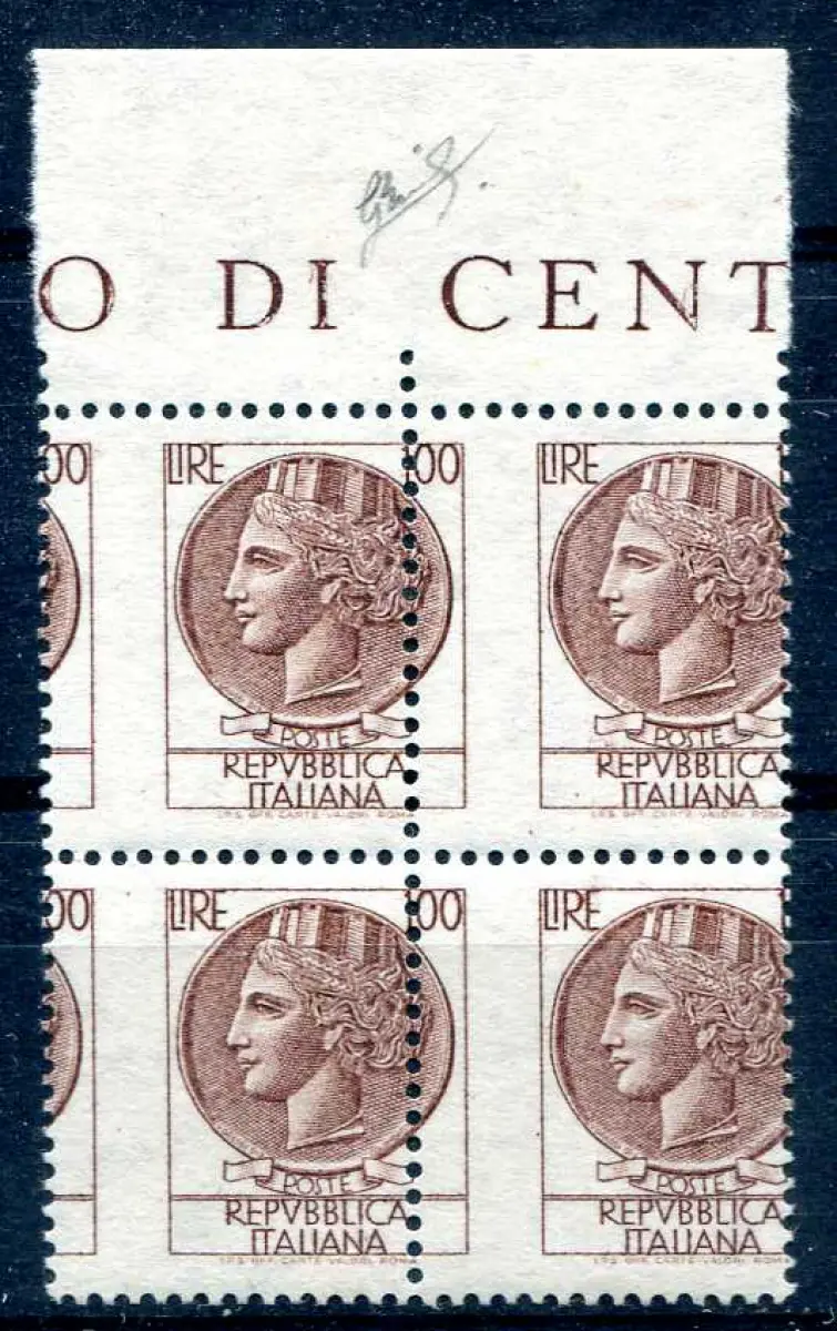 Syrakus Lire 100 Sorten stark verschobene vertikale Verzahnung Vollgummi - Syrakus Lire 100 Nr. 1083la Quartina b. von f. mit stark verschobener vertikaler Verzahnung (Sass. spec. n. 685Eb) - Gummi Arabica gleichmäßig leicht vergilbt - Cert. G. Biondi Code 757/3