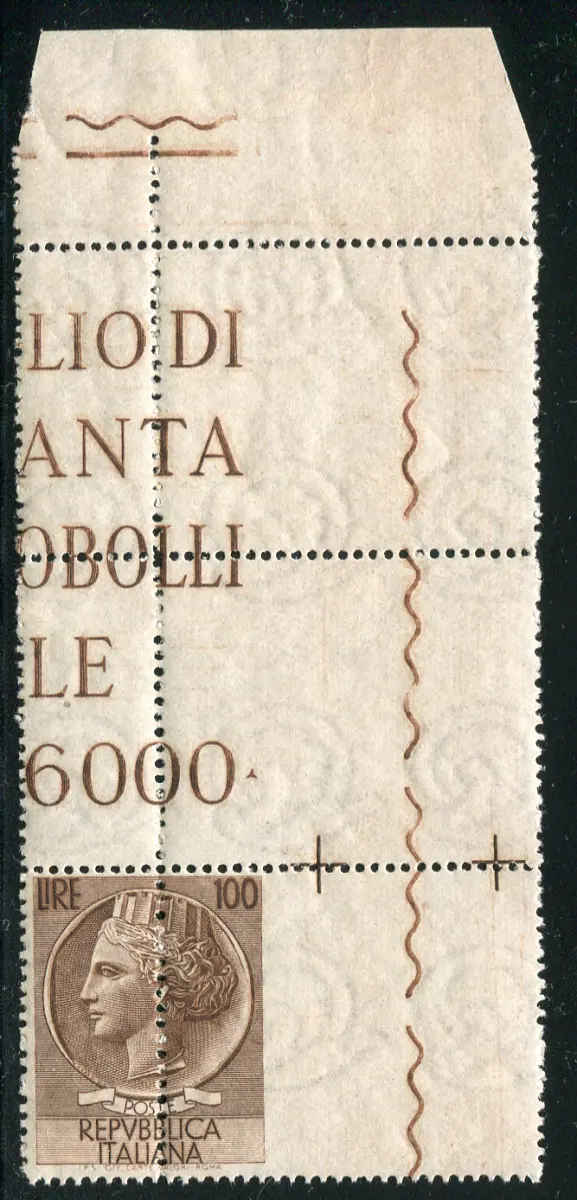 Syracusana Lire 100 Sorten verschobene Verzahnung Vollgummi - Syracusana Lire 100 Nr. 747db wunderschönes Exemplar a. von f. mit pro mm stark nach links verschobener Rechtsverzahnung. 11 - Schön und ungewöhnlich aus Eckblock Cod. 573/13