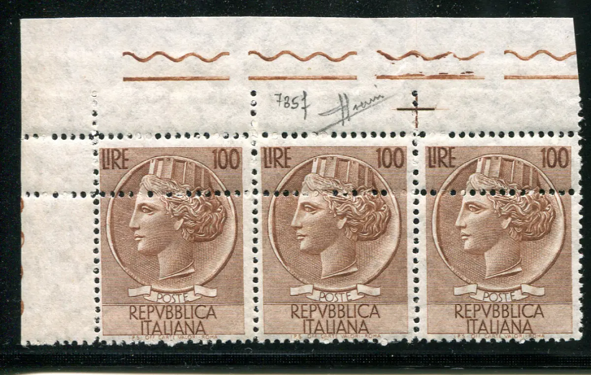 Syrakus Lire 100 Sterne II Sorte Zusatzverzahnung Vollgummi - Syrakus Lire 100 Sterne II Verzahnung 13,1/4 Nr. 785/Ih Dreierstreifen a. di f. mit einer zusätzlichen horizontalen Verzahnung, die alle Briefmarken auf Höhe der Stirn von Syrakus durchquert - Unveröffentlicht - Sorani Cod. 656/13