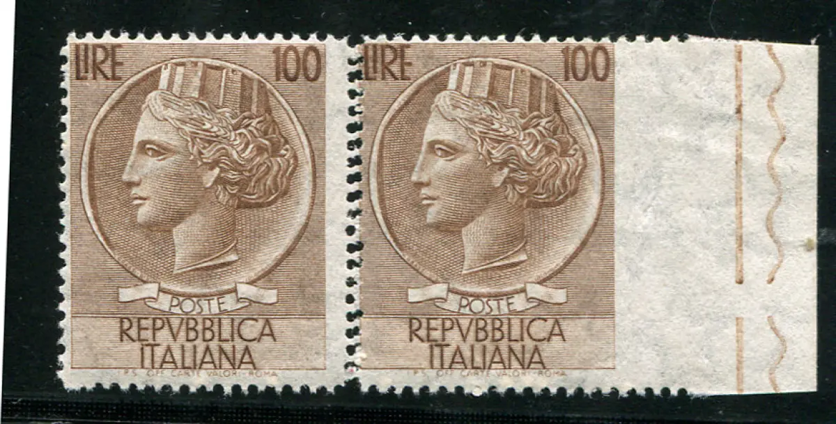 Vollgummi - Syrakus Lire 100 Sterne II Verzahnung 13,1/4 Nr. 785/I rechts ungezähntes horizontales Paar mit doppelter vertikaler Verzahnung in der Mitte - Seltene, nicht katalogisierte Sorte paarweise mit normaler Sorte (siehe Nr. 785/Ifaa) Cod. 651/13