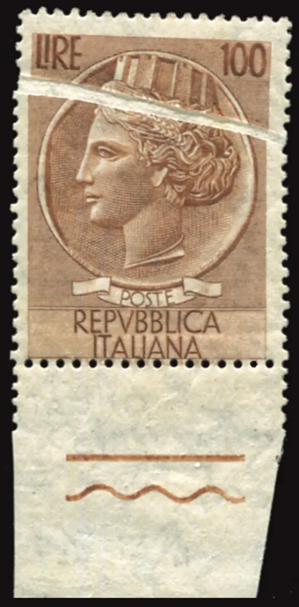 Syrakus Lire 100 auffällige Sorte horizontale Papierfalte Vollgummi MNH - Syrakus Lire 100 Nr. 785/II mit auffälliger horizontaler Papierfalte vor dem Drucken und Stanzen - auffällig und ungewöhnlich Cod. 489/16