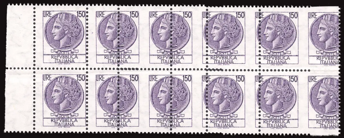 MNH - Vollgummi - Syrakus Lire 150 Nr. 1083A Zehnerblock mit Verzahnungsvarianten wegen Fehlfunktion des Bohrkammes - im Block befinden sich zweimal fünf verschiedene Sorten voneinander wiederholt - auffällig Cod. 822/17