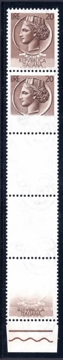 Syracusana Lire 20 Sorten Druck unvollständig und fehlt Vollgummi - Syracusana Lire 20 filigranes Rad Nr. 714 vertikaler Streifen von fünf Exemplaren, das erste normale das zweite mit unvollständigem Druck das dritte mit fehlendem Druck (siehe Sorte Nr. 714bb), das vierte Exemplar mit völlig fehlendem Druck und das letzte unvollständige verblassende Exemplar (siehe Sorte Nr. 714b + 714ba) - Selten zusammen - Kat. Euro 4.850 + Gebraucht Cod. 559/13