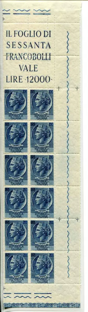 Syracusana Lire 200 Sorte Doppelverzahnung vertikal Vollgummi - Syracusana Lire 200 Nr. 816f Block von zwölf eckigen Bogenexemplaren mit doppelter vertikaler Verzahnung auf sechs Marken rechts - Schönes Set Code 484/7