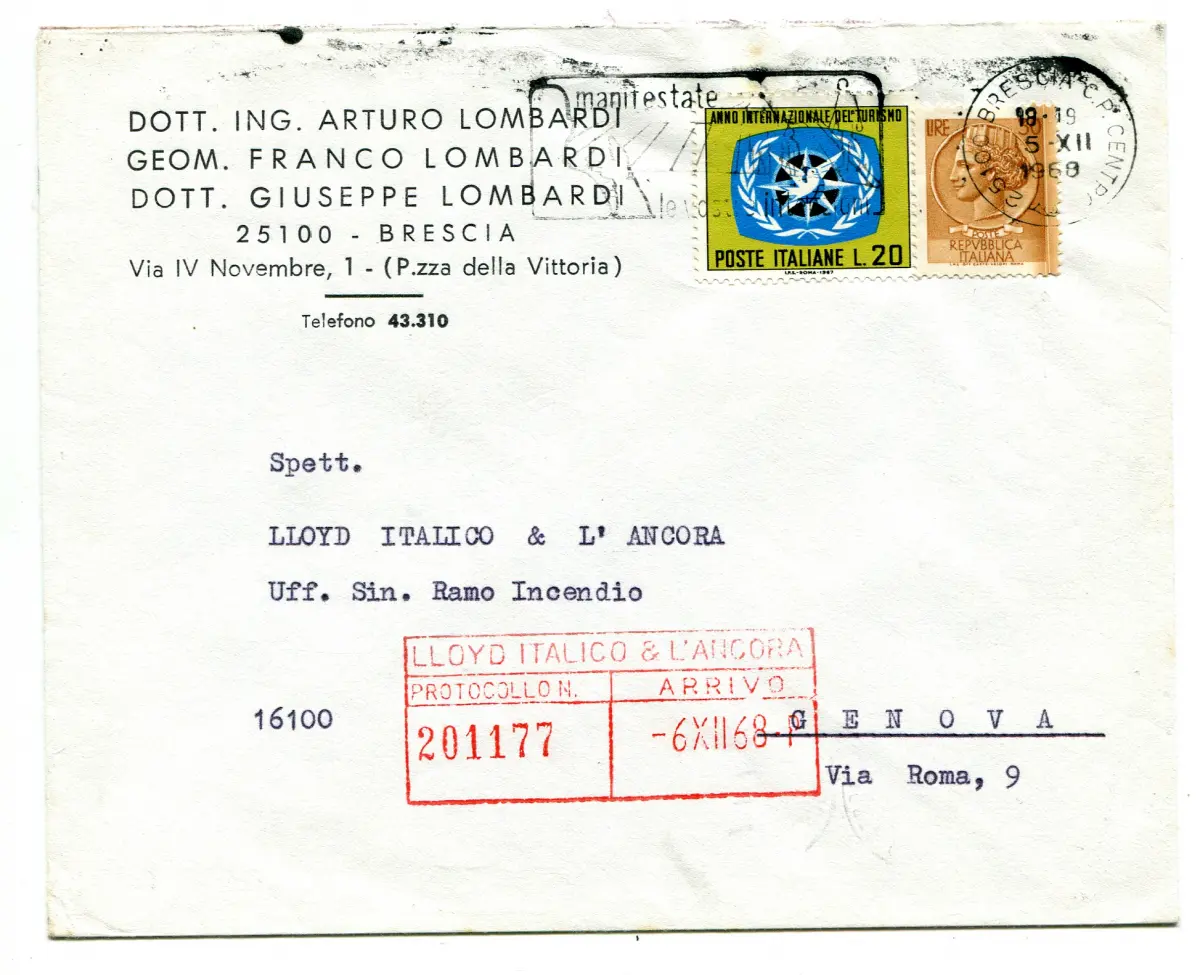 Syrakus Lire 30 Sorten Chirurgischer Schnitt Umschlag - Syrakus Lire 30 Nr. 1074 mit Sorte Chirurgischer Schnitt gut sichtbar auf Umschlag von Brescia nach Genua am 5.12.68 mit ergänzender Nr. 1057 - Ungewöhnlicher Gebrauch, nicht philatelistischer Code Nr. 685/2