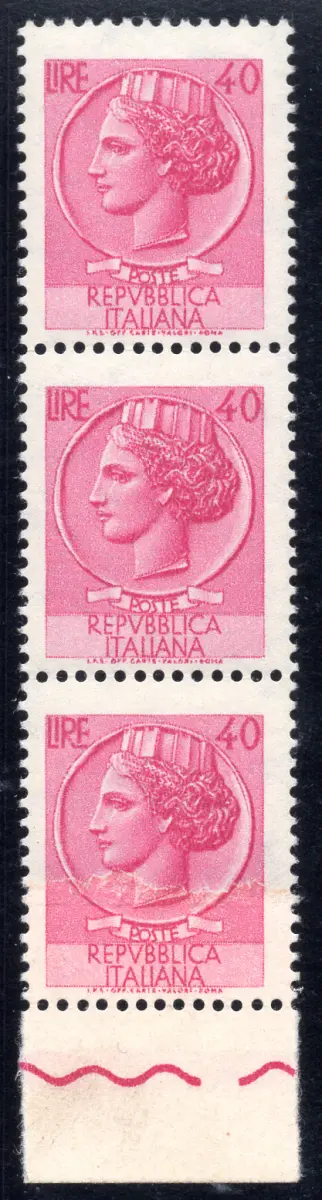 MNH - Vollgummi - Syrakus Lire 40 Nr. 1075i vertikaler Streifen von drei b. von f., das letzte Exemplar auf wiedergebundenem Papier gedruckt - Selten - Kat. euro 700 Cod. 817/17