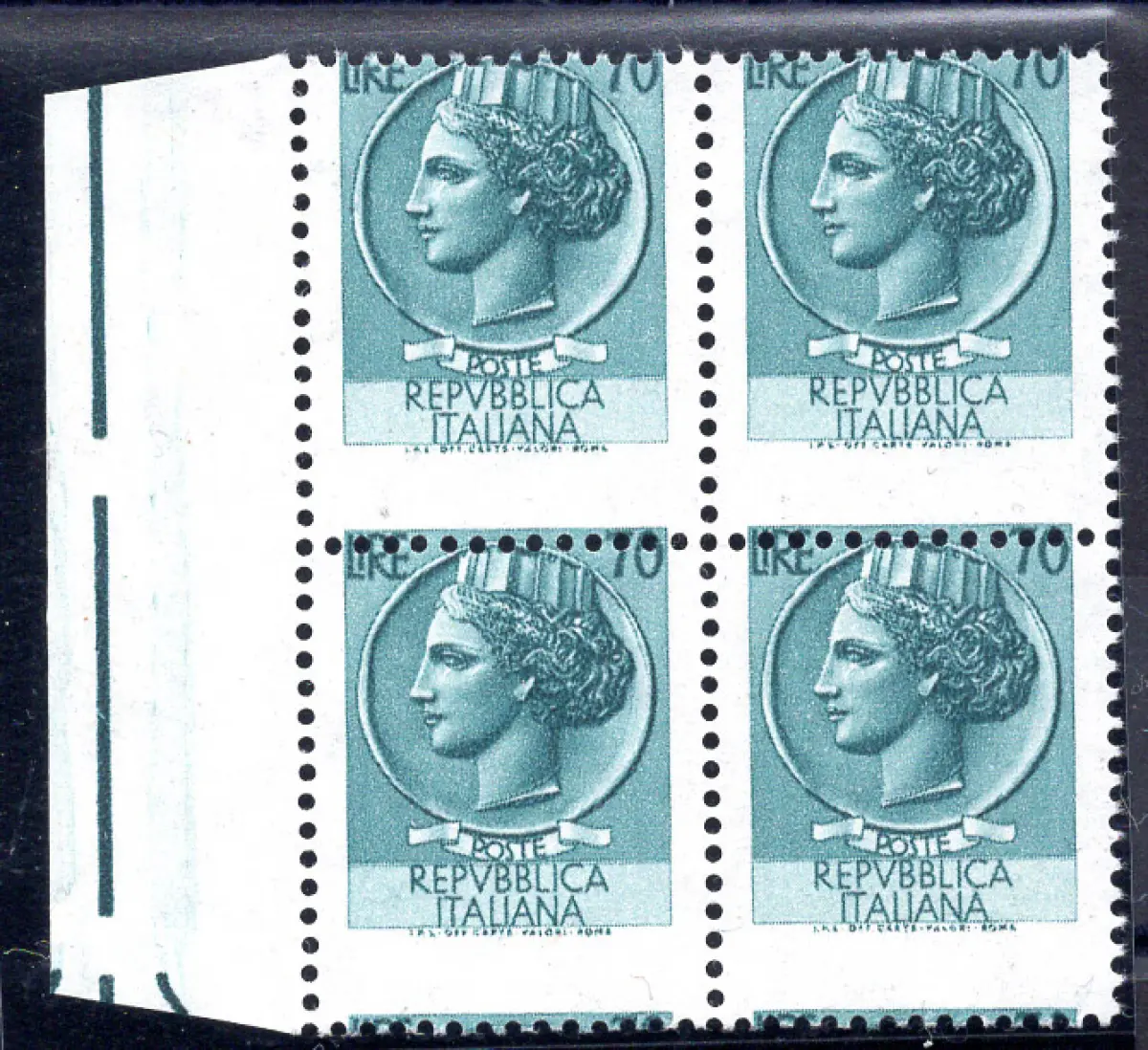 Syracusana Lire 70 (Arabica) Sorte Zahnung Vollgummi - Syracusana Lire 70 Nr. 1079 (Arabica) Quartina b. di f. mit stark nach unten verschobener horizontaler Verzahnung - Selten - Kat. 400 Cod. 740/13