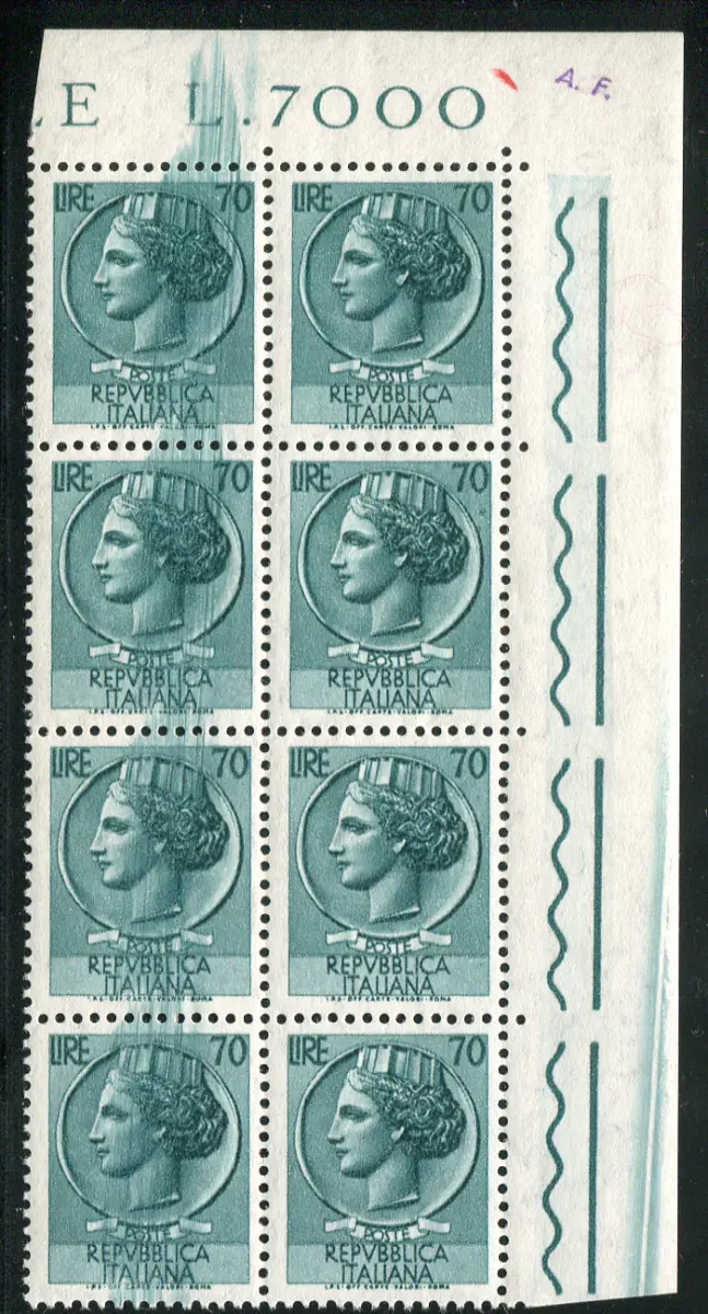 Syrakus Lire 70 Sterne I. Sorten Druckstreifen Vollgummi - Syrakus Lire 70 Sterne I. Nr. 775 Block von acht a. di f. (innensinusförmig) mit deutlichem Streifen und Farbentgraten auf vier Exemplaren - Ungewöhnlich Cod. 628/13