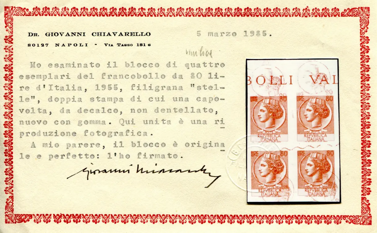 Syracusana Lire 80 (Vinyl) Quartina ungezähnt Vollgummi - Syracusana Lire 80 Nr. 1080 (Vinylkautschuk) Viertel ungezähnt b. von f. doppelter umgedrehter Druck spiegelnd und verschoben (durch Abziehbild) - horizontale Falzung auf zwei Exemplaren oben - Cert. Schlüssel - Schön und ungewöhnlich Cod. 744/13