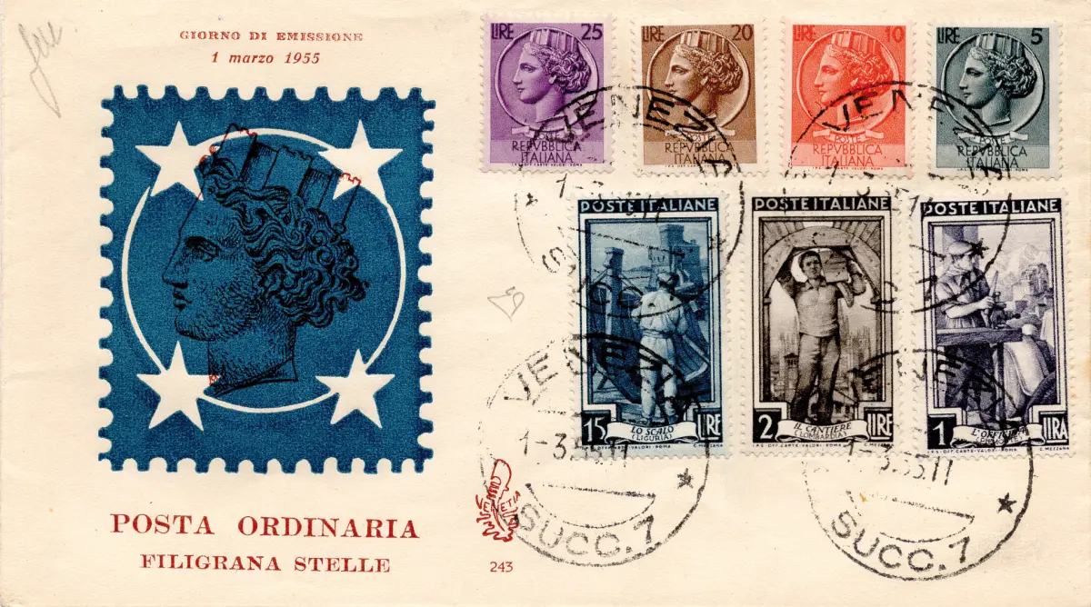 Briefumschlag - Syrakus und Arbeit sieben Werte Post Ordentlich ausgestellt am 1.3.55 auf Umschlag nicht gereist wie gewohnt - Selten - ED Cod. 518/17