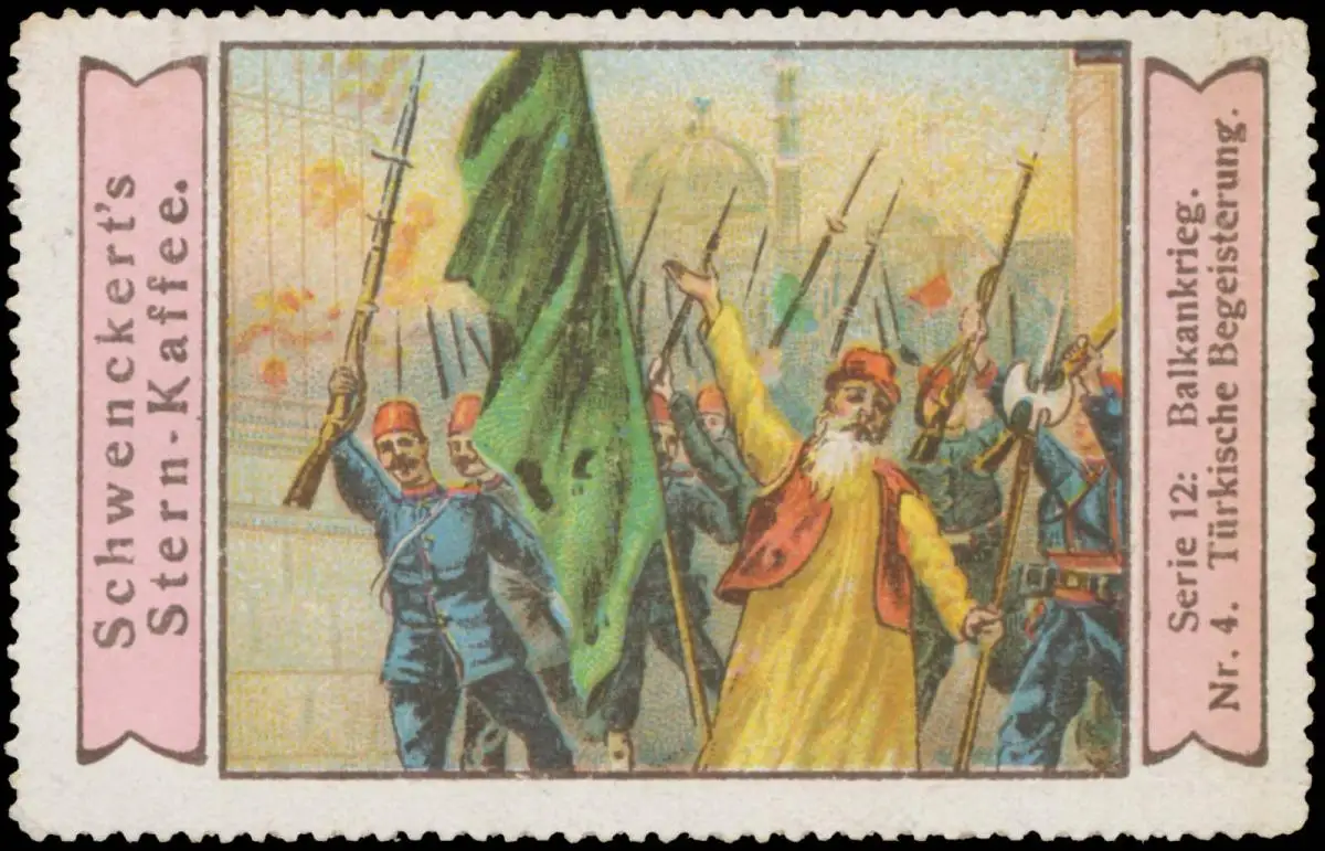 Serie 12 Balkankrieg, Nr. 4, Türkei, Schwenckerts Stern-Kaffee, Größe/Zustand: 5x7 , guter Zustand, Original alte Reklamemarke die seinerzeit für die Werbung benutzt wurde
