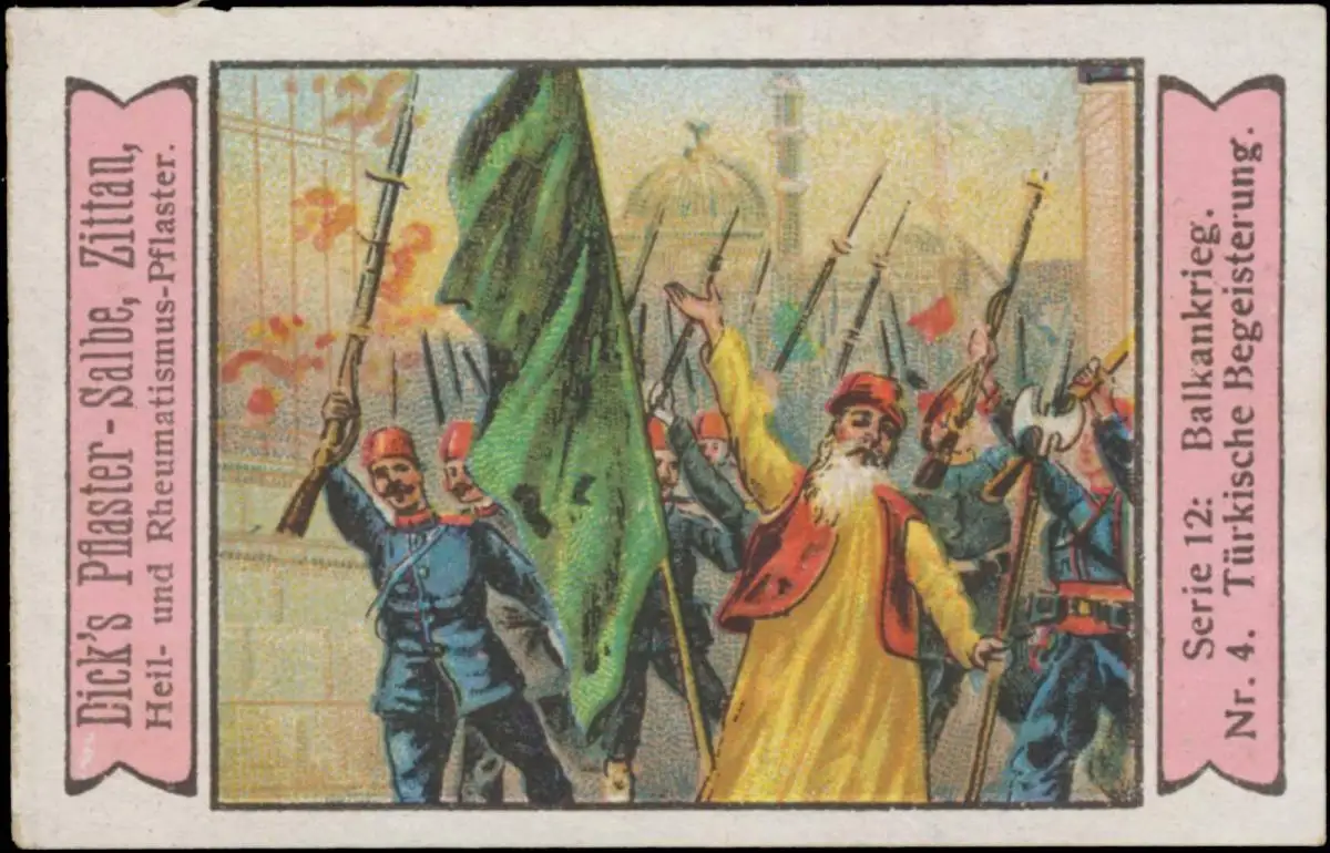 Serie 12 Balkankrieg, Nr. 4, Türkei, Dicks Pflaster-Salbe, Größe/Zustand: 5x7 , leicht beschädigt, Original alte Reklamemarke die seinerzeit für die Werbung benutzt wurde