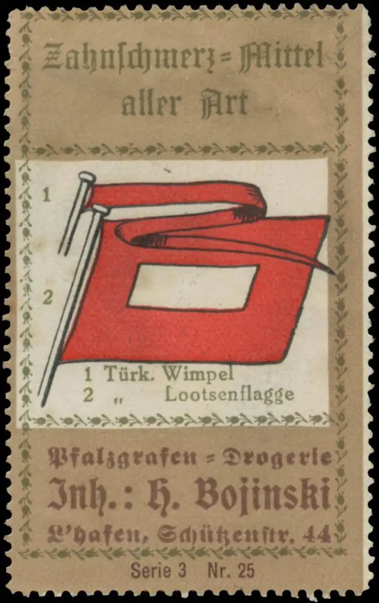 Zahnschmerzmittel, Pfalzgrafen Drogerie Inhaber: H. Bojinski , Größe/Zustand: 6x4 , guter Zustand, Original alte Reklamemarke die seinerzeit für die Werbung benutzt wurde