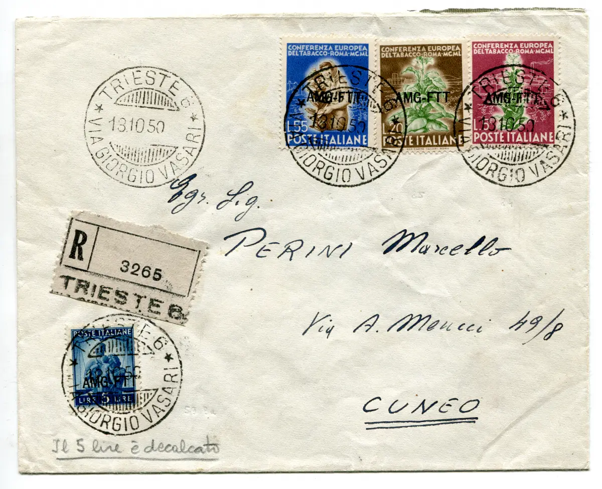 Tabak + Beilage auf Einschreiben BEUTEL - Tabak Nr. 84/86 Serie + Ergänzung Nr. 59 auf Einschreibenumschlag für Cuneo am 18.10.50 - Selten, im Doppeltarif Cod. 952/16