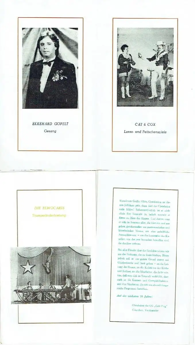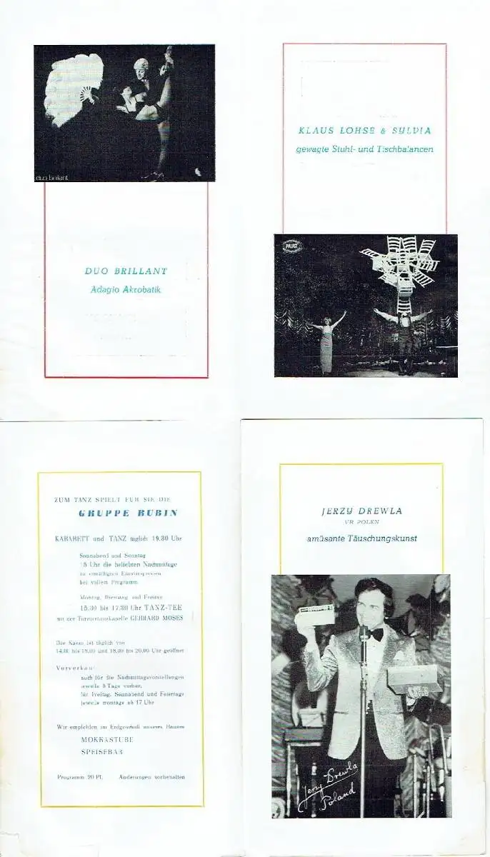 guter Zustand, geringe Gebrauchs- und Alterungsspuren: die meisten haben einen schmalen Wasserstreifen links und oberhalb der unteren Ecke und auch etwas wellig, 4 Hefte sind in diesem Bereich teils auch etwas beschädigt - sonst überwiegend sauber und ordentlich, gelegentlich kleinere Blessuren - 2 Hefte gefalten, 20 Programmhefte mit Programminfos und Aufzählung der Künstler aus Musik und Artistik inkl. des Conferenciers, Papier, je ca. 11,5 x 22,5, je 4-8 Seiten mit wenigen Bildern