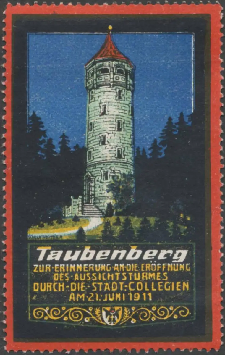 zur Erinnerung an die Eröffnung des Aussichtsturmes durch die Städt. Collegien, rot, Größe/Zustand: 6x4 , guter Zustand, Original alte Reklamemarke die seinerzeit für die Werbung benutzt wurde