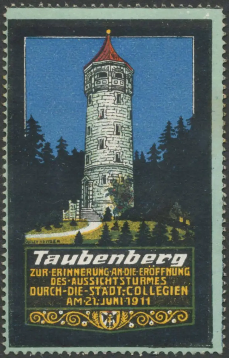 zur Erinnerung an die Eröffnung des Aussichtsturmes durch die Städt. Collegien, Größe/Zustand: 6x4 , guter Zustand, Original alte Reklamemarke die seinerzeit für die Werbung benutzt wurde