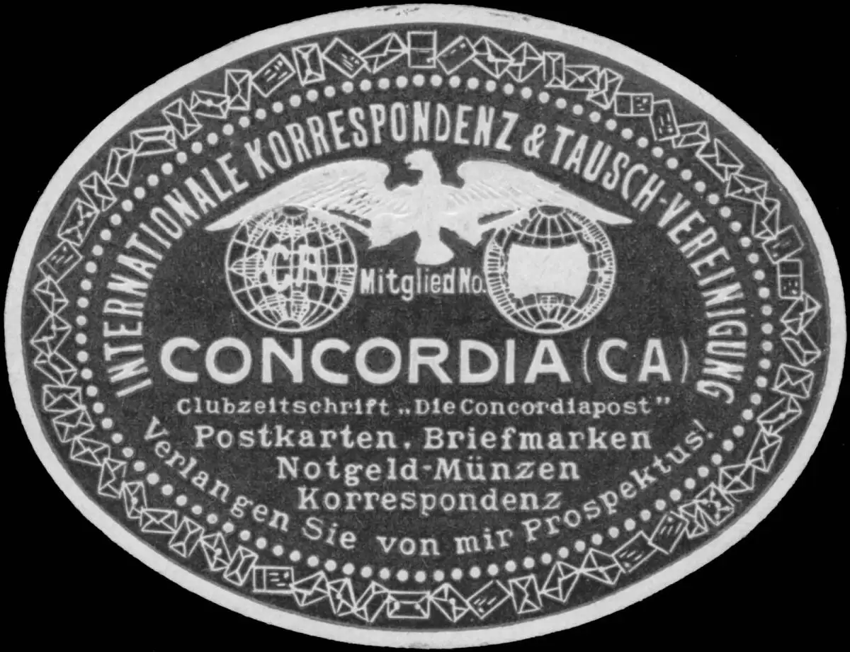 Internationale Korrespondenz & Tausch - Vereinigung Concordia - Clubzeitschrift : Die Concordiapost, Postkarten, Notgeld, Briefmarken, Münzen, Lindenstraße 55c, Größe/Zustand: 5x6 , guter Zustand, Original alte Reklamemarke die seinerzeit für die Werbung benutzt wurde