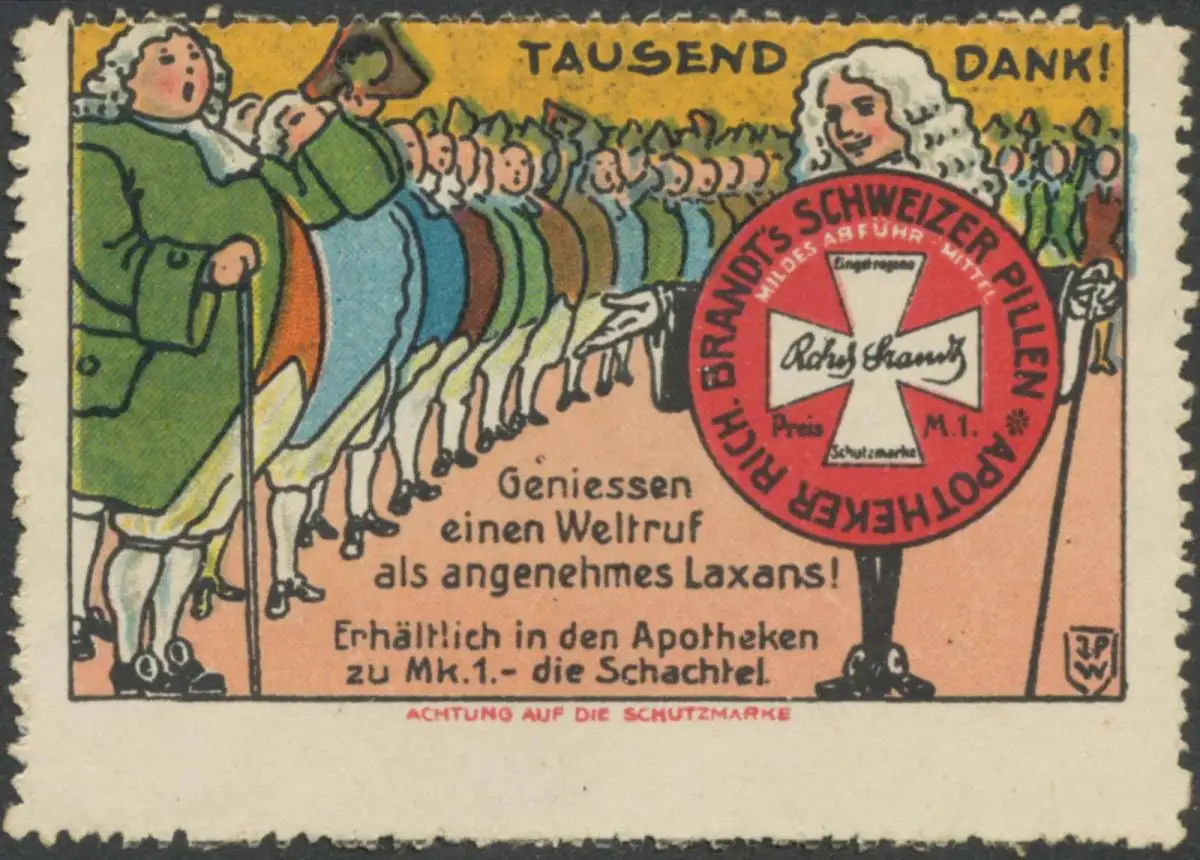 Brandts Schweizer Pillen - Abführmittel, Größe/Zustand: 5x7 , guter Zustand, Original alte Reklamemarke die seinerzeit für die Werbung benutzt wurde