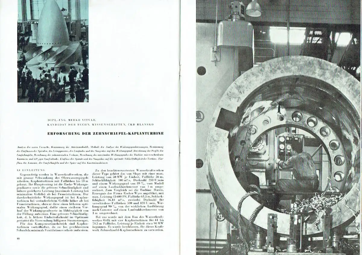 guter bis sehr guter Zustand, geringe Gebrauchs- und Alterungsspuren: oben am Rand alle Seiten teils leicht angeknickt, Auflage in deutscher Sprache nur 250 Exemplare - Ing. Vilém Hebelka, ČKD Blansko: Einige Einzelheiten über die hydraulische Konstruktion von Francis-Laufrädern - Dipl.-Ing. Miloslav Druckmüller, ČKD Blansko: Einfluss der spezifischen Eintrittsgeschwindigkeit auf die Form der Wirkungsgradkennlinie - Kandidat der techn. Wissenschaften Dipl.-Ing. Zdenĕk Budlovský: Messung mit Mikrosonden in verunreinigten Flüssigkeiten - Dipl.-Ing. Mirko Vitvar, Kandidat der techn. Wissenschaften, ČKD Blansko: Erforschung der Zehnschaufel-Kaplanturbine, Softcover, ca. 21 x 29,5, 32 Seiten mit einigen Bildern