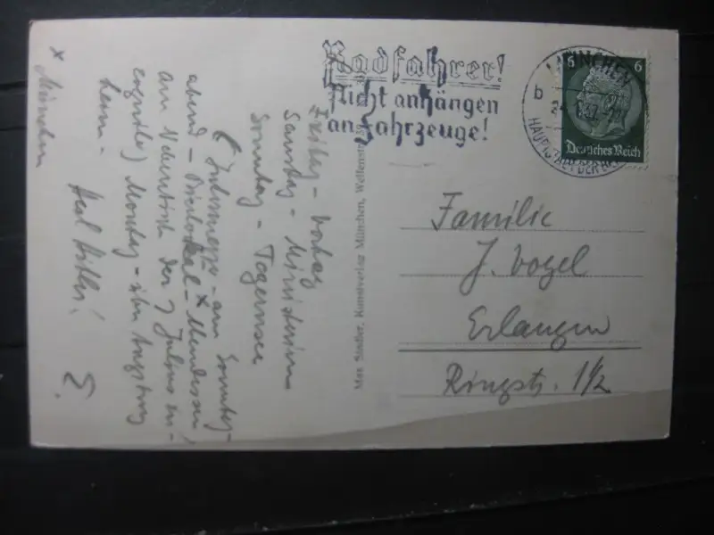 ca. 1937; Unschärfen, Spiegelungen, Verbiegungen, Verwerfungen sind allein durch das abfotografieren bedingt; Karte ist beidseitig abgebildet, Erhalt siehe Scan; ist das Foto qualitativ nicht aussagekräftig genug, kann es besseres Foto angefordert werden. Rückgabe bei Karten ist generell ausgeschlossen.