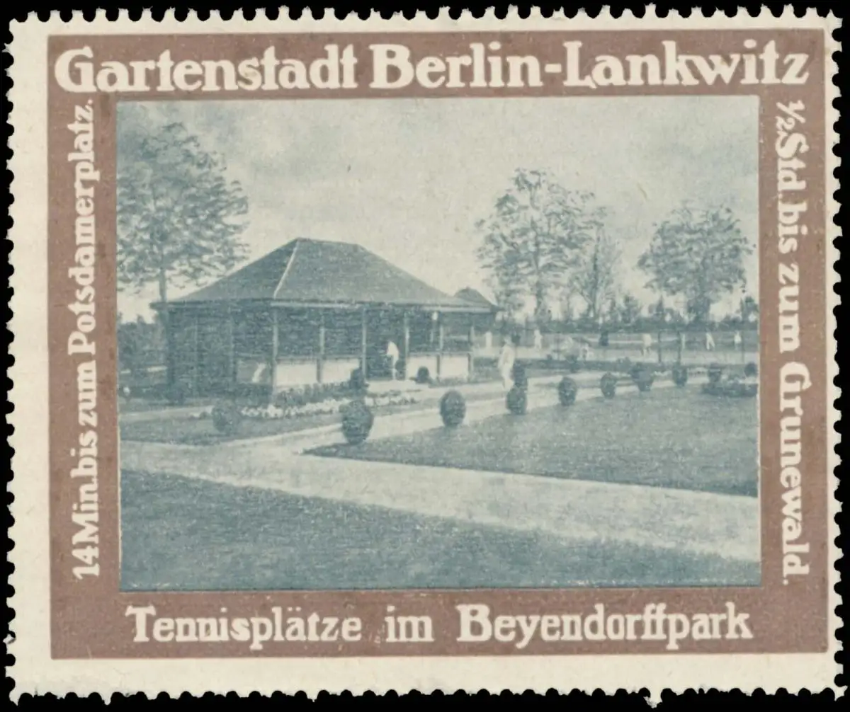 Gartenstadt Berlin-Lankwitz, 1/2 Stunde bis zum Grunewald, 14 Minuten bis zum Potsdamerplatz, braun, Tennis, Größe/Zustand: 5x6 , guter Zustand, Original alte Reklamemarke die seinerzeit für die Werbung benutzt wurde