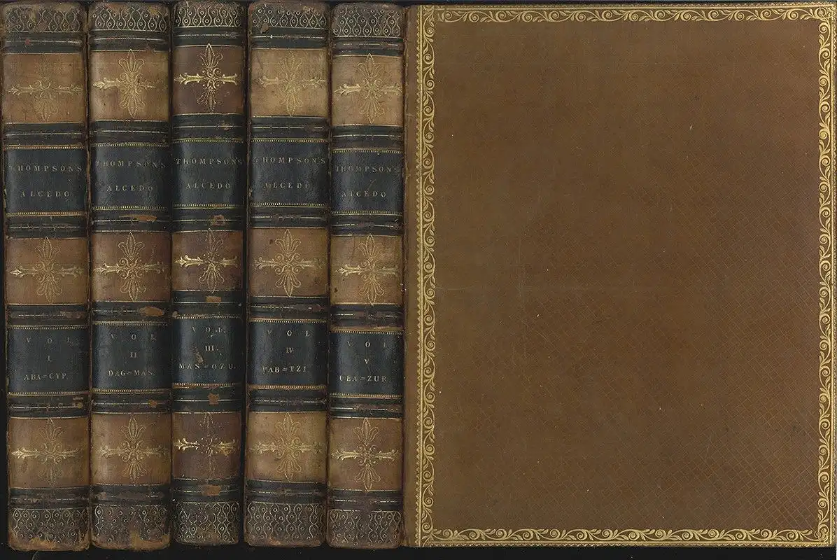 Bemerkungen: Sabin 683 - Erstausgabe der durch George Alexander Thompson (1783-?) überarbeiteten und erweiterten Übersetzung von Antonio de Alcedos (1735-1812) historisch-geographischem Nachschlagewerk für Amerika und die West-Indischen Kolonien, das erstmals zwischen 1786-89 in Madrid erschienen ist. "Thompsons edition for ist additions etc. is infinitely superior to the original" (Sabin). Sabin nennt zudem einen sehr seltenen Atlasband. In der gedruckten Widmung an Nicholas Vansittart (1766-1851), der Thompson zur Übersetzung ermutigt hat, schreibt er:" The work was undertaken six yerars ago, when i was only twenty-three years old, and has ever since been the chief employment of those hours which the necessary attendance of my office has left at my disposal." (vol. I). With engraved armorial bookplates on each front paste-down. First edition in English, earlier published in Madrid as "Diccionario geográfico-histórico de las Indias Occidentales ó América: es á saber: de los reynos del Perú, Nueva España, Tierra Firme, Chile, y Nuevo reyno de Granada" in five volumes from 1786 to 1789. The rare atlas with a series of folding maps of the Americas by Aaron Arrowsmith, not present here.