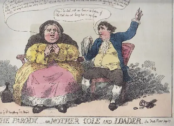 Bemerkungen: BM Satires 6514 - Lettered with title followed by "See Foots Minor page 29.", text within image, and publication line: "Pubd April 10th. 1784 by W. Humphrey No 227 Strand". - North as Mother Cole is seated full-face in an arm-chair, the tips of his fingers sanctimoniously together. Beside him sits Fox, as Loader, a handkerchief in his right hand, his left pointing upwards. North says, "Ay I am agoing; a wasting and a wasting - what will become of the House when I am gone Heaven knows - No - When people are Missed then theyre Mourn`d - Sixteen years have I lived in St Stephens Chaple comfortably and creditably; and tho I say it, could have got bail any hour of the day! no knock me down doings in my house, a set of regular sedate sober Customers - no rioters - Sixteen did I say - Ay, eighteen years have I paid Scott and Lot - and during the whole time nobody have said Mrs North Why do you so? unless twice that I was threatned with impeachment and three times with a Halter!" Fox says, "May I lose deal, with an honour at bottom, if Old Moll does not bring tears in my Eyes." Mother Cole wears a hood and loose gown over her petticoat, her shoes are slashed to ease her bulging feet. By her side is a bottle labelled `Constitution Cordial`. Fox is dressed in his customary manner; at his side is an overturned dice-box and dice. (BM) North is represented as the sanctimonious bawd (for whom Mother Douglas was the supposed original) who became a follower of Whitefleld, Fox as the sharping gamester. The words of the play are cleverly parodied, the indictments of Mother Cole being changed into the threats of impeachment which Fox had made against North. (M. Dorothy George, `Catalogue of Political and Personal Satires in the British Museum`, VI, 1938)