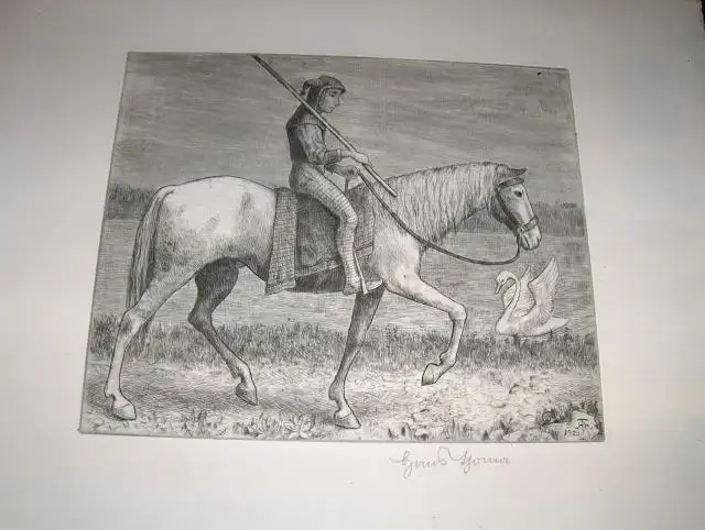 HANS THOMA *. ORIGINAL-RADIERUNG (s/w.), " Einsamer Ritter auf Pferd, mit Schwann am Boden, Mittelalterl. Kostüme: Bouffon oder Narr ?", handsigniert. unt.-rechts mit Bleistift
