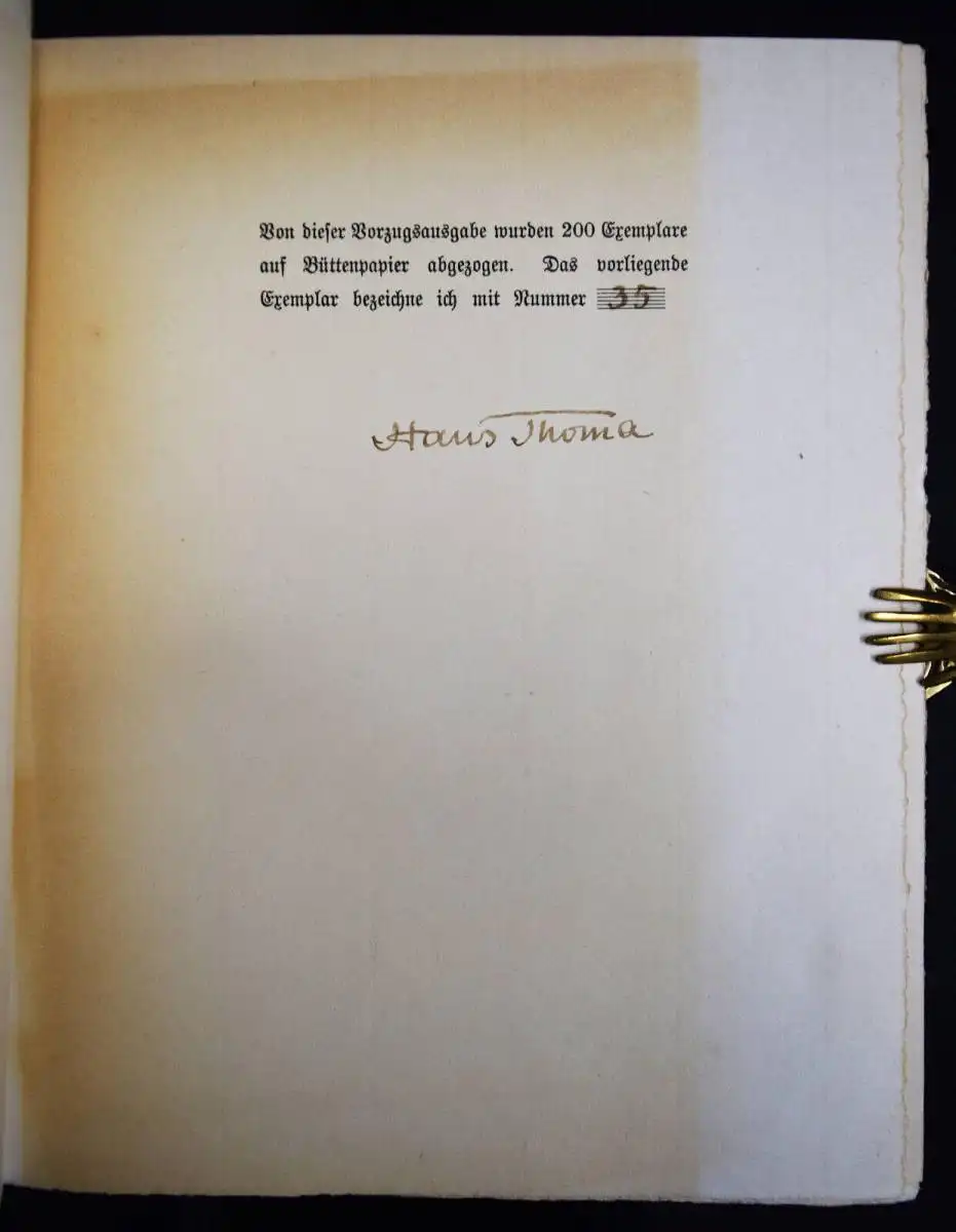 Erste Ausgabe. – Eines von 200 num. Exemplaren der Vorzugsausgabe; von H. Thoma im Druckvermerk signiert. – Rücken stellenweise berieben, sonst gut erhalten.