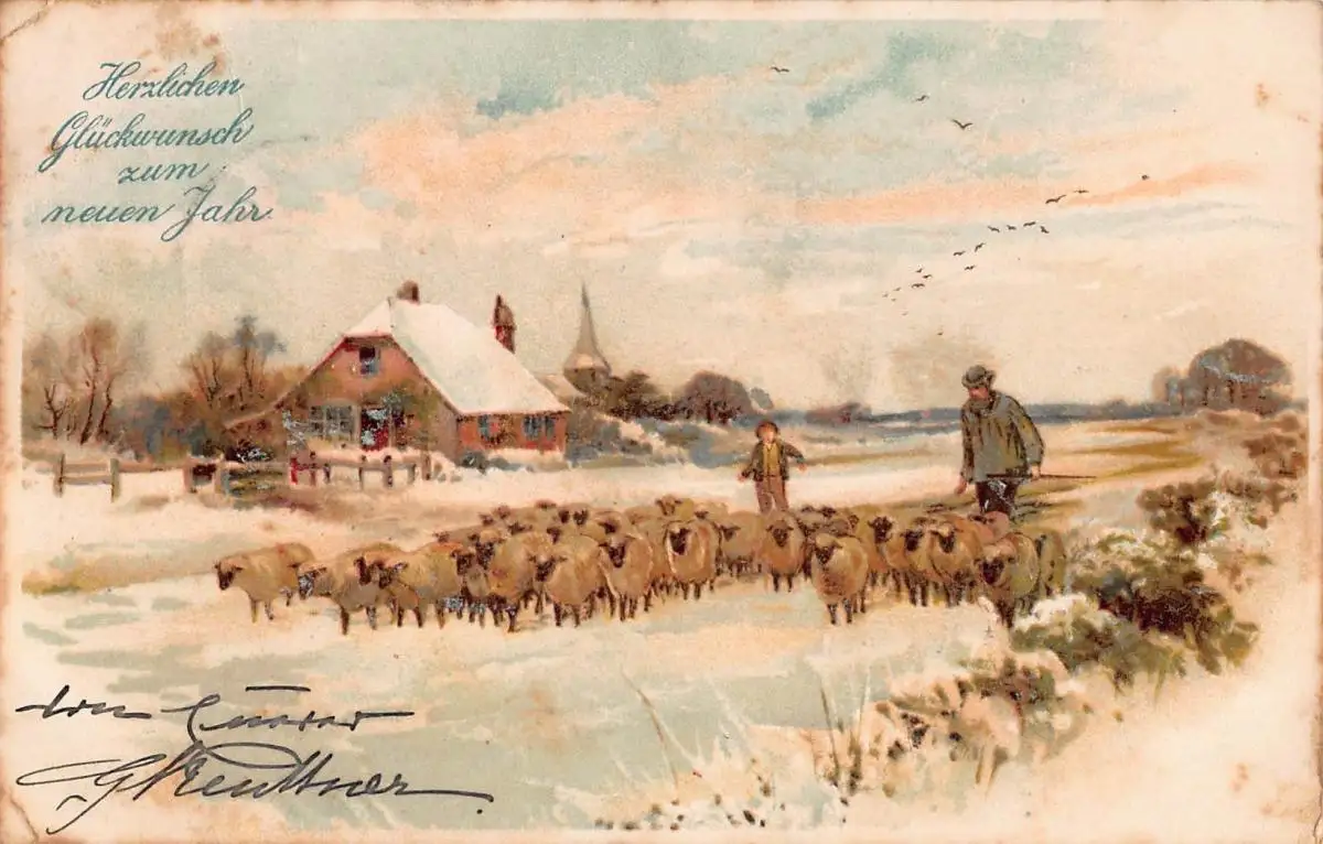 Tiere: Schafherde, Hirte und Junge am Dorfrand gl1901 150.863