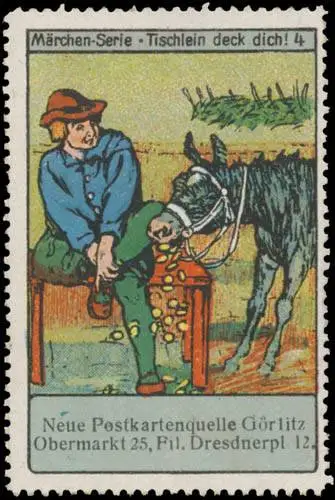 Märchen-Serie. Neue Postkartenquelle in Görlitz, Bruno Hanzig, Ansichtskarten und Schreibwaren, Obermarkt 25, Filiale: Dresdner Platz 12, Größe/Zustand: 6x4 , guter Zustand, Original alte Reklamemarke die seinerzeit für die Werbung benutzt wurde