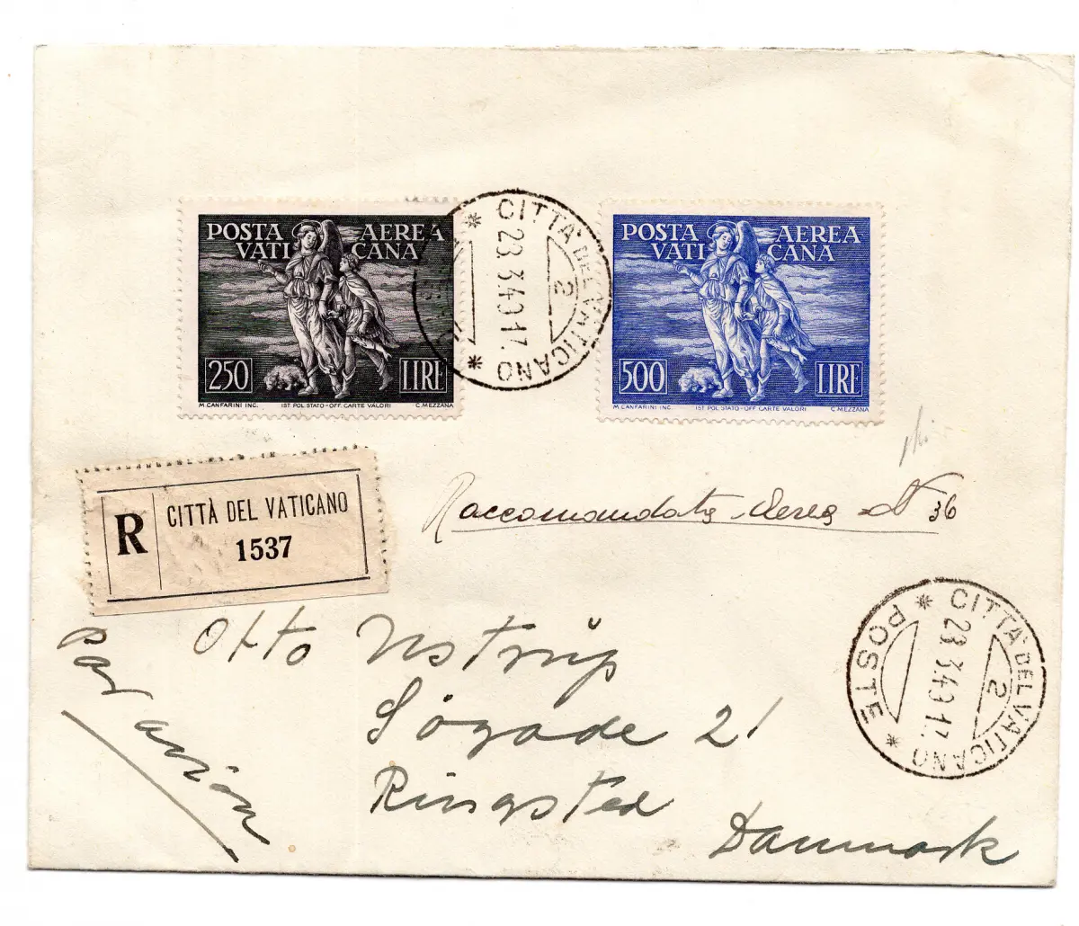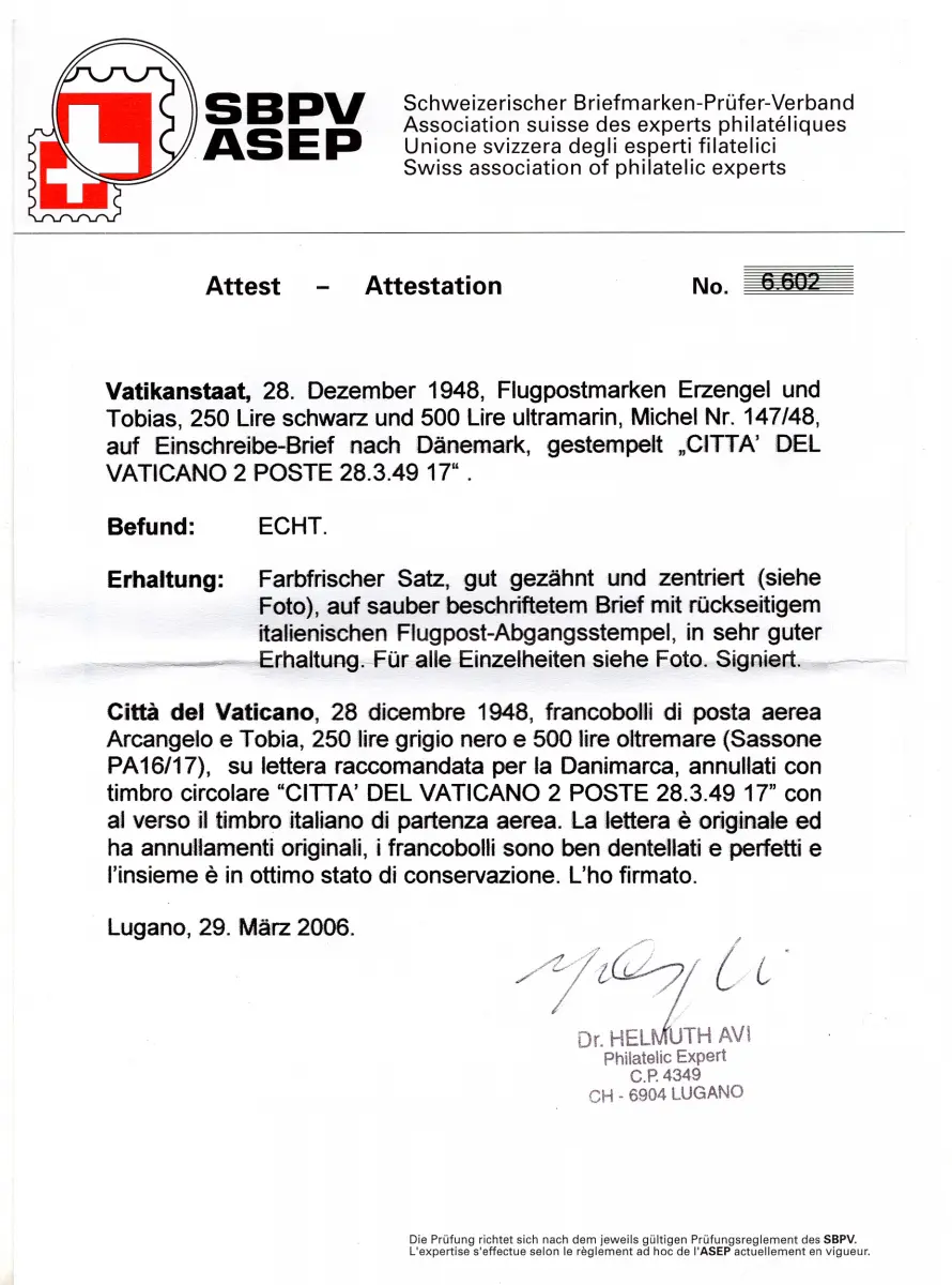 Umschlag - - Luftpost Tobia Nr. 16/17 Serie auf Einschreiben auf dem Luftweg nach Dänemark am 28.3.49 - auf der Rückseite storniert Rom Luftpost, ohne Annullierung der Ankunft in Dänemark - Sehr schön, Zertifikat Dr. Helmuth Avi (Schweizerischer Verband der Philatelisten) Cod. 2498/WEB