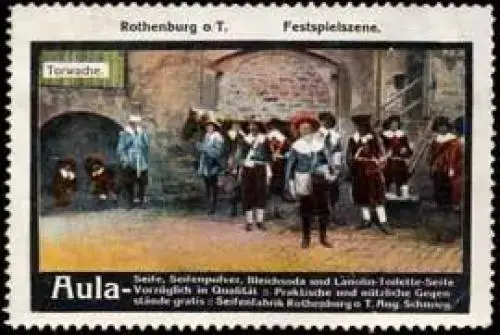 Festspielszene, Aula - Seife, Seifenpulver, Bleichsoda und Lanolin - Toilette - Seife vorzüglich in Qualität - Praktische und nützliche Gegenstände gratis , Größe/Zustand: 5x7 , guter Zustand, Original alte Reklamemarke die seinerzeit für die Werbung benutzt wurde