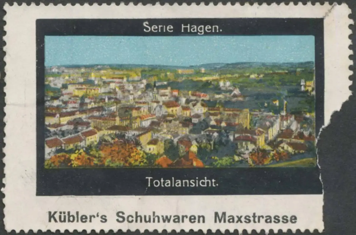 Serie: Hagen, Küblers Schuhwaren, Größe/Zustand: 5x7 , beschädigt, Original alte Reklamemarke die seinerzeit für die Werbung benutzt wurde