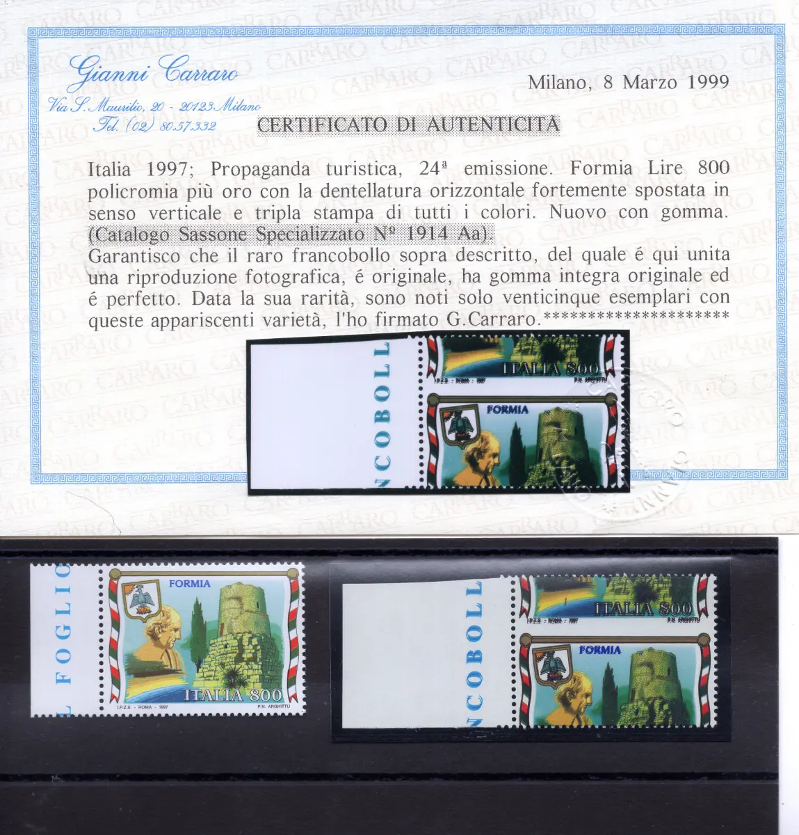 MNH - Vollgummi - - Touristica '97 Lire 800 Formia Nr. 2280 mit stark verschobener horizontaler Verzahnung und dreifachem Farbdruck (Kat. Einheitliche Nr. 2315Bb) - Selten, 25 bekannte Exemplare - Zert. Carraro (erweitert signiert) - Kat. euro 900 Cod.780/182