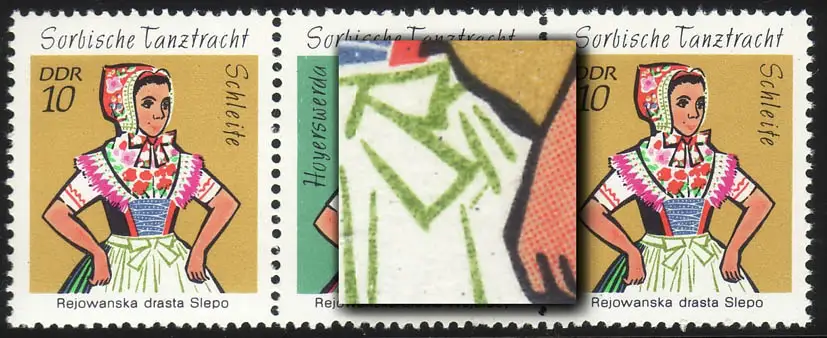 zusätzlicher Strich zwischen zwei Falten rechts unten an der Schürzen-Schleife, primärer Plattenfehler auf der 10-Pf- Marke
