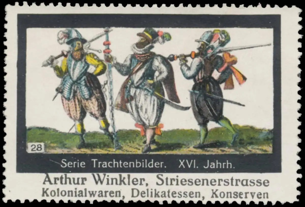 Serie: Trachtenbilder, XVI. Jahrhundert, Bild 28, Arthur Winkler Kolonialwaren, Delikatessen, Konserven, Striesenerstraße, Größe/Zustand: 4x6 , guter Zustand, Original alte Reklamemarke die seinerzeit für die Werbung benutzt wurde