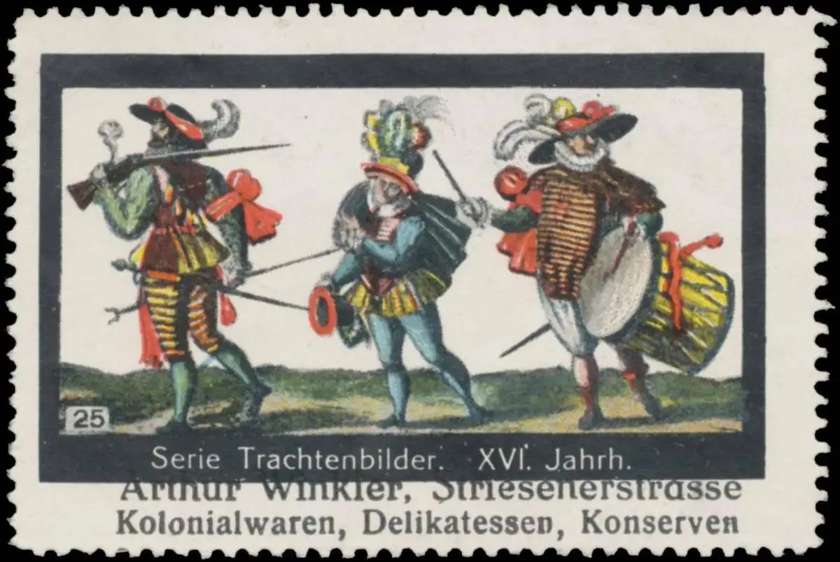 Serie: Trachtenbilder, XVI. Jahrhundert, Bild 25, Arthur Winkler Kolonialwaren, Delikatessen, Konserven, Striesenerstraße, Größe/Zustand: 4x6 , guter Zustand, Original alte Reklamemarke die seinerzeit für die Werbung benutzt wurde
