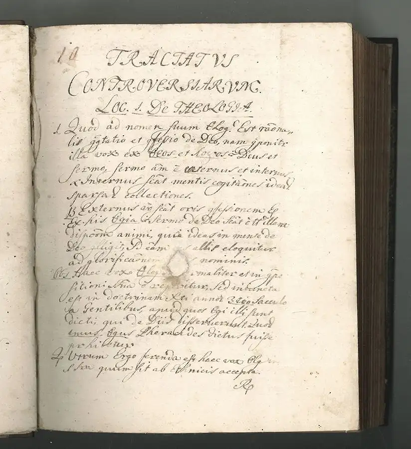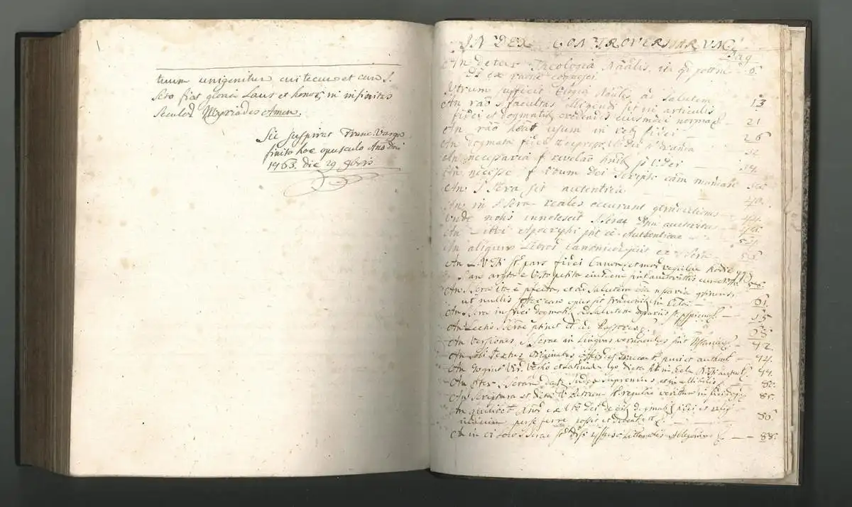 Bemerkungen: Für uns nicht näher zuordenbare Abschrift eines theologischen Traktates wohl von mehrerem Händen in enger, sauberer Kurrentschrift geschrieben. Am Ende unterzeichnet:" [...] Franc. Varga finito hoc opusculo An(n)o Dni. 1763. Die 29. 9bris (Novembris)." Die Handschritt beginnt mit "Tractatus Controversiarum. Loc. 1. De Theologia". Am Schluss mit Index.