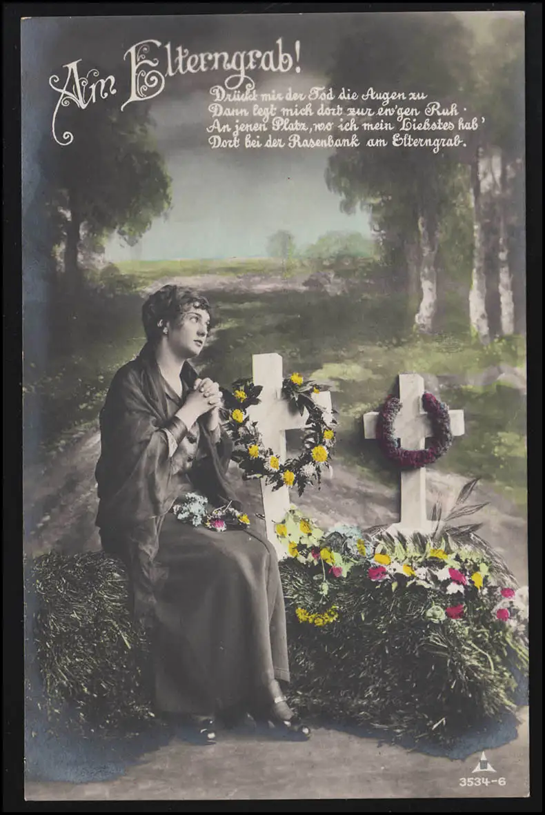Trauer-AK Am Elterngrab - Betende Frau mit Blumen Grabkreuze, ungebraucht