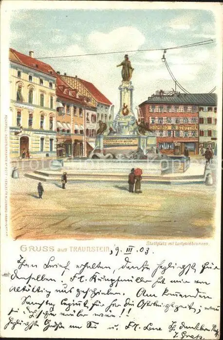 Traunstein Oberbayern Stadtplatz Luitpoldbrunnen Traunstein postalisch gelaufen 1903 Erhaltung siehe scans Alte Ansichtskarte Postkarte Paoletti