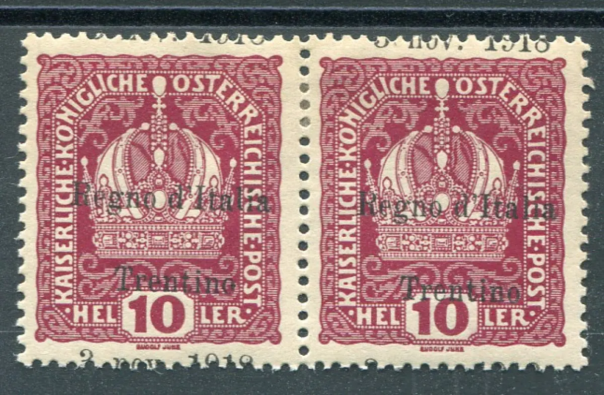 Trentino-Südtirol - 10 Heller Aufdruck in die untere Linguella-Spur verschoben - Trentino-Südtirol - 10 Heller Nr. 4 Paar mit stark nach unten verschobenem Aufdruck - Edelsorte nicht katalogisiert Code 851/11