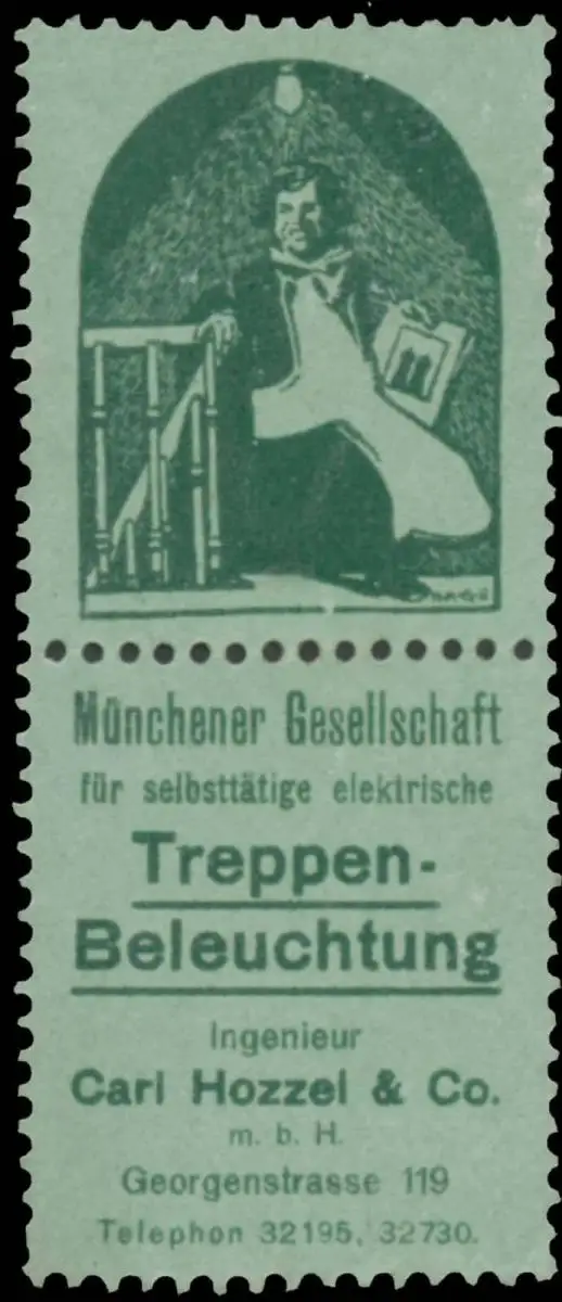 Münchener Gesellschaft für selbsttätige elektrische Treppenbeleuchtung, Georgenstraße 119, Licht, Beleuchtung, Münchner Kindl, Größe/Zustand: 5x2 , guter Zustand, Original alte Reklamemarke die seinerzeit für die Werbung benutzt wurde