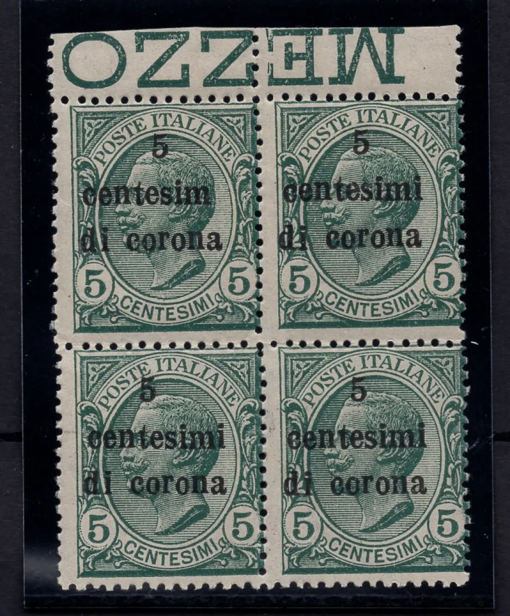MNH - Vollgummi - Trient und Triest - Löwen 5 Cent. von Kronen auf Cent. 5 Nr. 3 Quartina b. von f., unb Exemplar mit fehlendem Centfehler (i) - postfrisch einwandfrei mit Vollgummi - Kat. euro 180 Cod. 2875/WEB