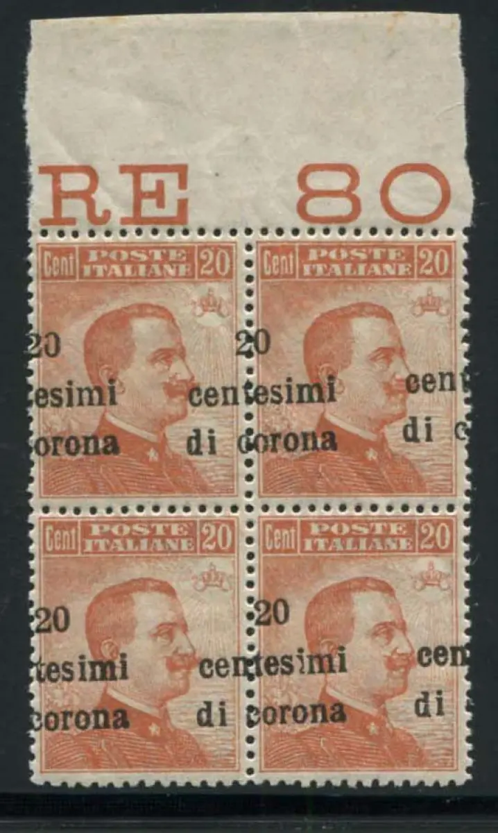 Trient und Triest - Michetti 20 Cent. auf 20 verschobenen Aufdrucken Vollgummi - Trient und Triest - Michetti 20 Cent. su 20 n. 5ufg Quartina b. von f. mit stark zu Pferd verschobenem Aufdruck - Kat. 840 Code 818/7
